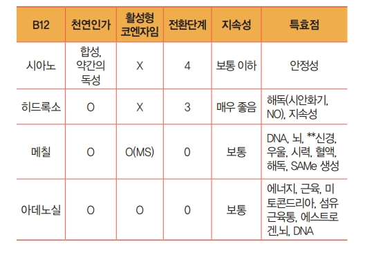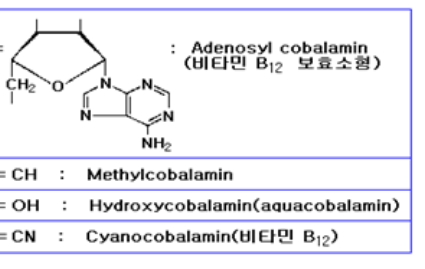 표에서 알수 있듯이 활성형 B12로 Methylcobalamin 과 Adenosylcobalamin 이 보통 상업적으로 판매되는 형태인 것을 알 수 있습니다.