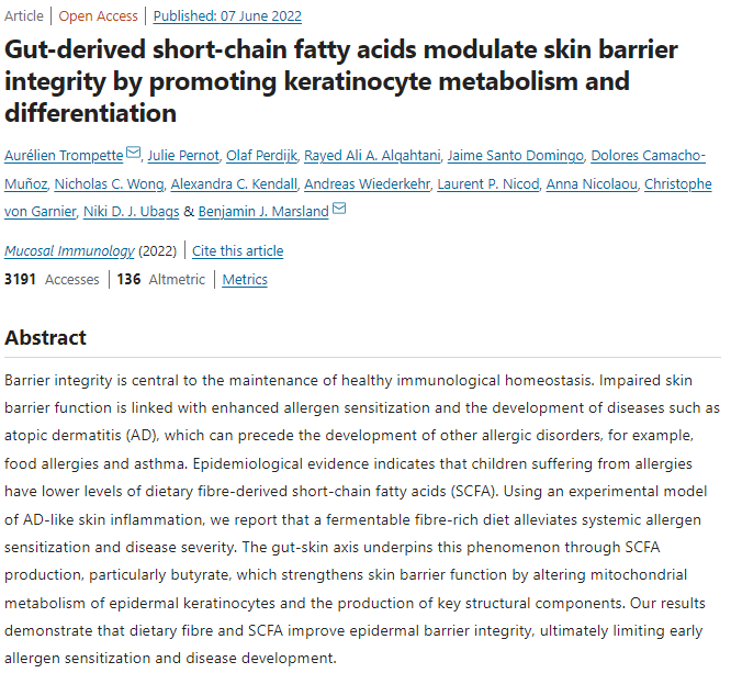 "짧은 사슬 지방산은 광범위한 효과를 가지고 있습니다,"라고 마스랜드는 설명했습니다. "핵심적인 효과는 그것들이 일부 세포의 신진대사를 위한 연료로 작용할 수 있다는 것입니다. 이번 연구에서 우리는 짧은 사슬 지방산인 뷰티레이트가 각질세포에 연료로 사용되고 분화를 증가시켜 피부 장벽의 질을 향상시킨다는 것을 발견했다.