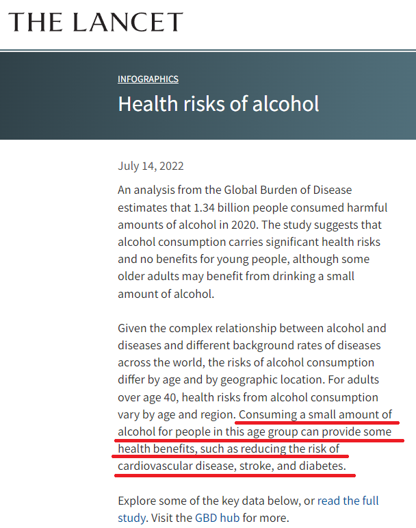미국 워싱턴의대 건강측정평가연구소(IHME) 세계 질병·상해·위험요인 연구팀은 204개 국가와 지역별로 30년간 축적된 15~95세 연령에 대한 통계를 분석한 결과 술이 40세 미만에게는 건강에 도움이 안 되지만, 기저질환이 없는 40세 이상에게는 건강상 이득이 있다는 연구는 사실을 발표했다.
