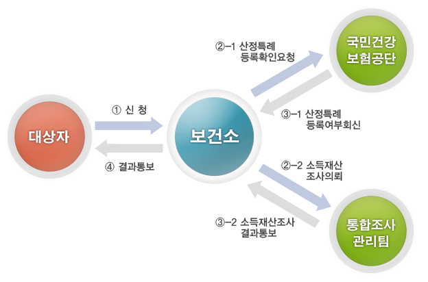 3) 공단에서 산정특례 등록여부를 보건소에 회신, 시.군.구청(통합조사관리팀)에서 환자가구와 부양의무자가구에 대한 소득재산조사 실시 후 보건소에 결과통보