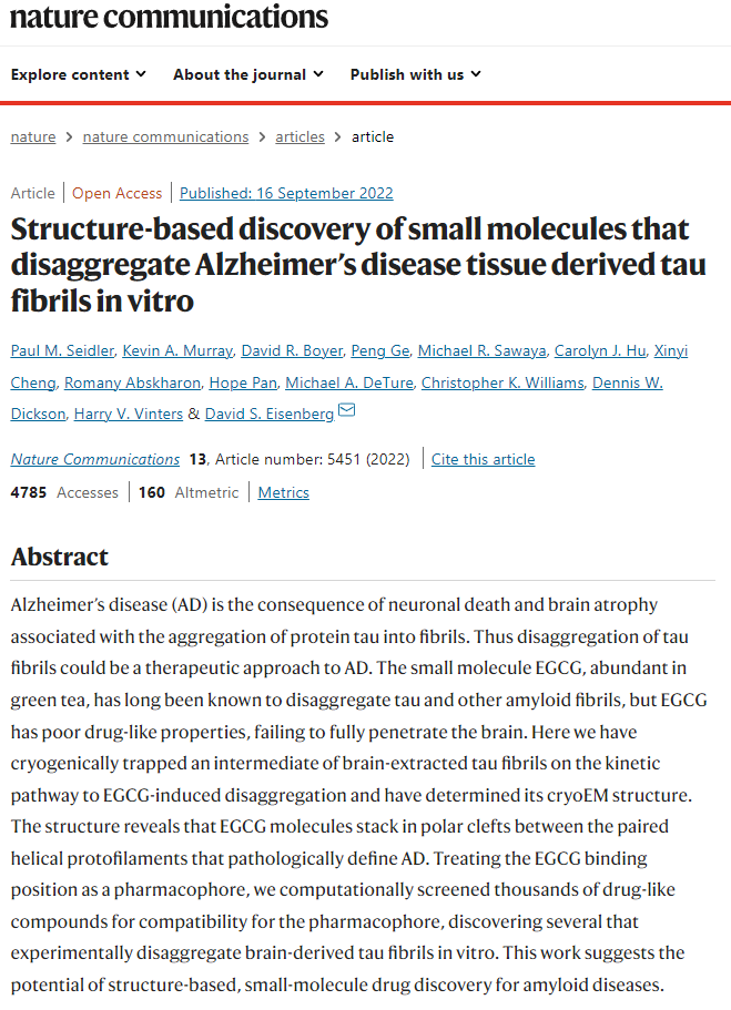 Nature Communications에 발표된 논문에서, UCLA 생화학자들은 EGCG가 어떻게 타우 섬유를 층층이 부서내는지 설명한다. 그들은 또한 뇌로 쉽게 침투할 수 없는 EGCG보다 더 나은 잠재적 약물 후보자를 만들 수 있는 같은 방식으로 작동 가능성이 있는 다른 분자들을 어떻게 발견했는지 보여준다. 이 발견은 타우 섬유와 다른 아밀로이드 섬유의 구조를 목표로 하는 약물을 개발함으로써 알츠하이머, 파킨슨병 및 관련 질병과 싸울 수 있는 새로운 가능성을 열어줄것으로 평가된다.