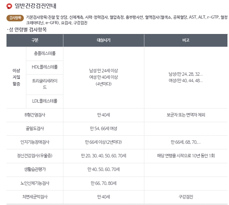 : 이상지질혈증, B형간염, 골밀도, 인지기능장애, 정신건강(우울증), 생활습관평가, 노인신체기능검사, 치면세균검사