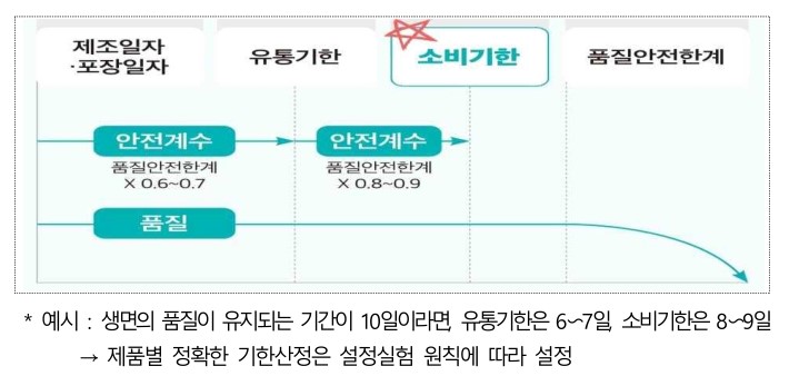 : 소비기한은 소비자 중심의 표시제로써 식품의 맛‧품질 등이 급격히 변하는 시점을 설정실험 등으로 산출한 품질안전한계기간의 80~90%로 설정한 것이고, 유통기한은 영업자 중심의 표시제로서 품질안전한계기간의 60~70%로 설정한 것입니다.