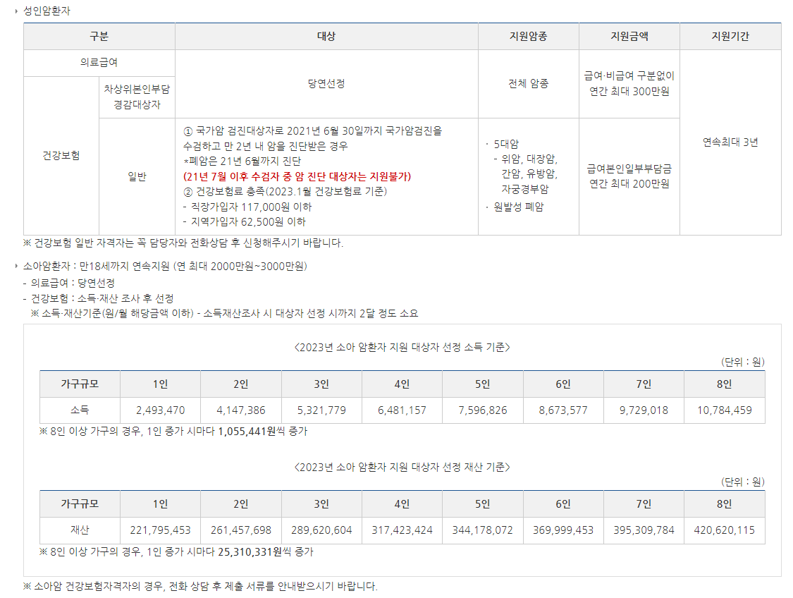 - 성인암: 건강보험가입자(본인일부부담금 연간최대 200만원)