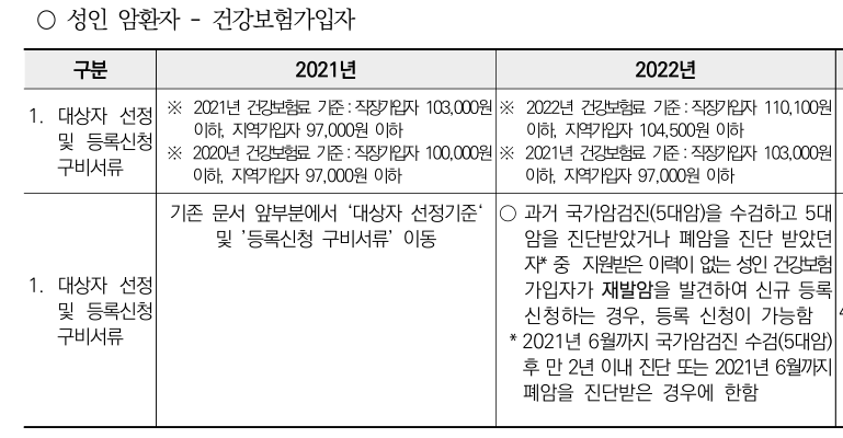 - 성인암: 건강보험가입자(본인일부부담금 연간최대 200만원)