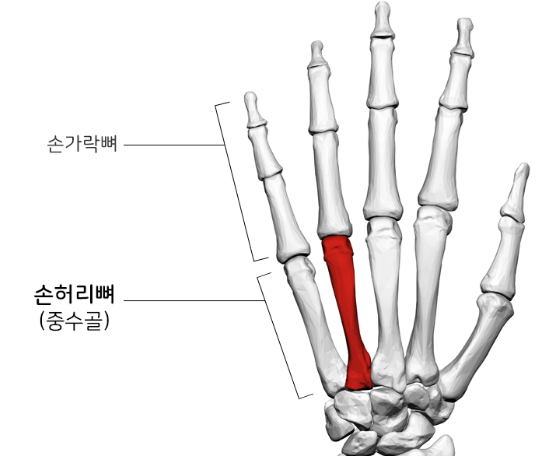 - 중수골은 손목뼈와 손가락뼈 사이의 손허리뼈를 가리키며, 손을 구성하는 뼈 중에서도 길고 크기 때문에 외부의 충격에 의해 손상되기 쉬운 편입니다.