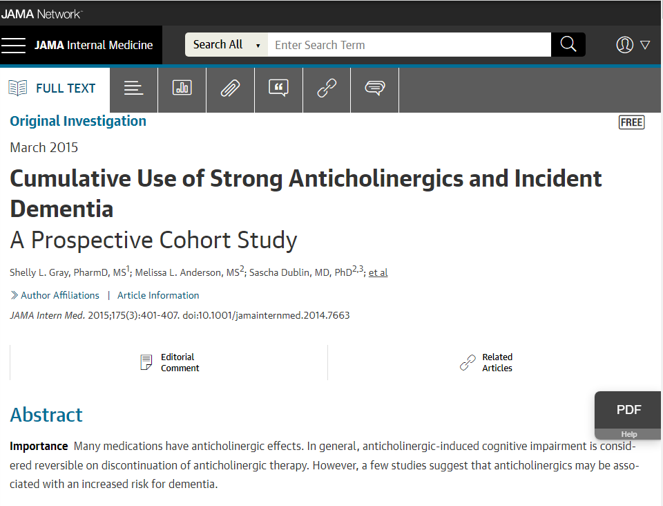 - 2015년 JAMA 온라인판에 게재된 워싱턴대 약대 Shelly Gray 박사팀의 연구에 의하면, 항콜린제를 장기간 사용한 인원의 20%에서 치매 발생은 23.2%에 달했는데(이 가운데 79.9%는 알츠하이머병 진단), 해당 약물의 사용 빈도가 높을수록 치매 위험도가 동반 상승했다고 합니다.